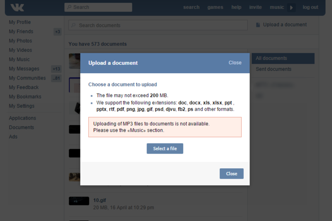 Социальная сеть «ВКонтакте» закрыла возможность загружать MP3-файлы в раздел «Документы», пишет сообщество Live Express