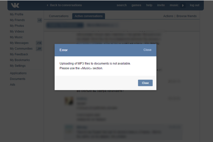 Кроме того, MP3 нельзя прикреплять к сообщениям. Это относится к любым файлам этого формата, включая те, что создал сам пользователь соцсети. Теперь после загрузки MP3 соцсеть сообщит, что не поддерживает её и попросит воспользоваться разделом «Мои аудиозаписи». Загружать музыкальные файлы в других форматах (например, OGG) всё ещё можно. Ограничения связаны с претензиями со стороны правообладателей, прокомментировал изданию TJ пресс-секретарь «ВКонтакте» Георгий Лобушкин.