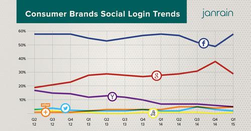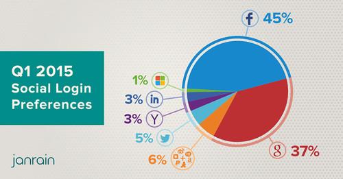 Facebook продолжает наращивать аудиторию пользователей, которые используют аккаунт социальной сети для авторизации на сторонних сайтах. Об этом свидетельствуют данные отчёта компании Janrain за Q1 2015 года. Ситуации способствовало увеличение доли на B2B рынке и на сайтах потребительских брендов