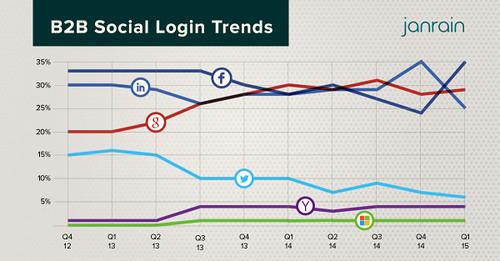 Больше всего доля Facebook выросла на B2B-рынке и на сайтах потребительских брендов. Компания увеличила свою долю на B2B-рынке на 11 процентных пунктов – до 35%, отвоевав лидерство в этой отрасли у LinkedIn. Доля социальной сети для профессионалов в первом квартале этого года сократилась на 10 процентных пунктов – до 25%. Тем не менее, аналитики Janrain отмечают, что LinkedIn может вернуть свои позиции после внедрения изменений в API этой весной. В частности тех, что связаны с добавлением кнопки «Подать заявку через LinkedIn» (Apply with LinkedIn) на корпоративных сайтах.