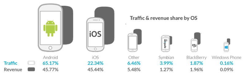 По итогам первого квартала 2015 года Android лидирует не только по объему трафика мобильной рекламы, но и, впервые за все время, по объему доходов от нее
