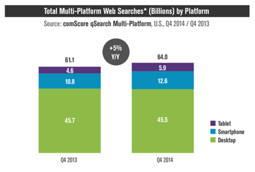 ComScore ранее выпустил отчет и график, показывающий относительный объем поисковых запросов в США на десктопах, планшетах и смартфонах. По данным компании, в 4-м квартале 2014 года в США мобильные запросы (планшеты + смартфоны) составили 29% от общего объема поиска.