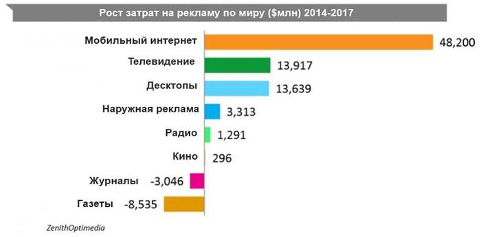 Основным драйвером роста рекламных бюджетов являются мобильные устройства. К 2017 году маркетологи потратят на мобильную рекламу вдвое больше средств, чем в 2014 году, что составит 12,9% от всего рекламного рынка.