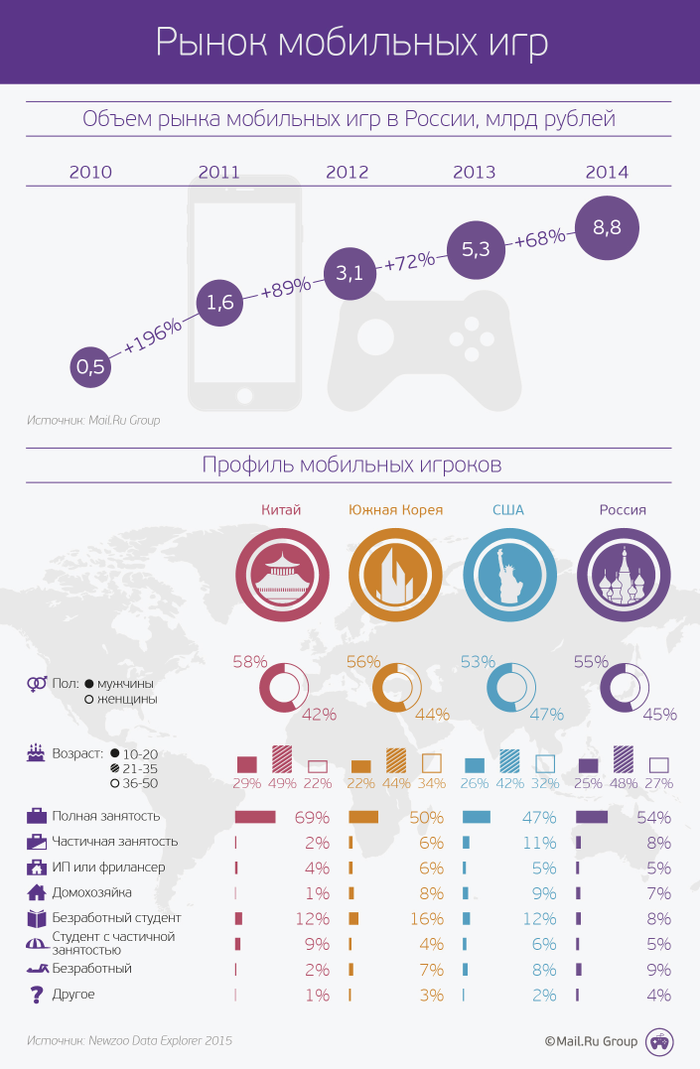 Поданным экспертов Mail.Ru Group, в 2014 г. рынок мобильных игр вырос на 68% и составил 8,8 млрд рублей. По сравнению с 2010 г. объем сегмента увеличился более чем в 17 раз