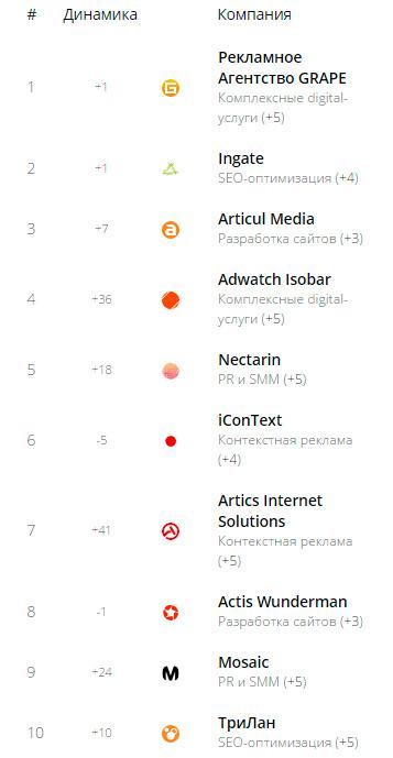 Рейтинг возглавило агентство GRAPE, серебро и бронзу получили Ingate и Articul Media.