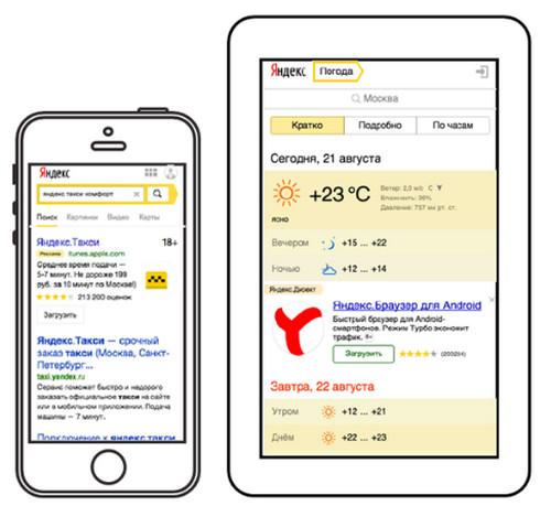 Новый тип объявлений «реклама мобильных приложений» с описанием приложения и кнопкой «Загрузить» показываются на мобильном поиске Яндекса и в мобильной Рекламной сети по выбранным ключевым словам или условиям ретаргетинга. Когда пользователь кликает по объявлению, он попадает прямиком на страницу приложения в магазине приложений и может скачать его на свое устройство в один клик.
