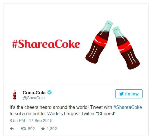 А сейчас, впервые в истории, Twitter изготовил набор эмоджи для своего партнера-спонсора – компании Coca-Colа. Если вы вставите в свой твит хэштег #ShareaCoke, вы увидите изображение двух чокающихся бутылочек колы, пишет Marketingland. Таким образом, бренд надеется поставить мировой рекорд, устроив самое масштабное братание в Twitter.