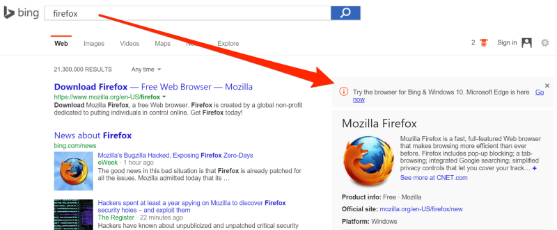 Англоязычные пользователи поисковой системы Bing доложили о появлении рекламы браузера Edgeпри попытке найти продукты конкурентов - Chrome или Firefox