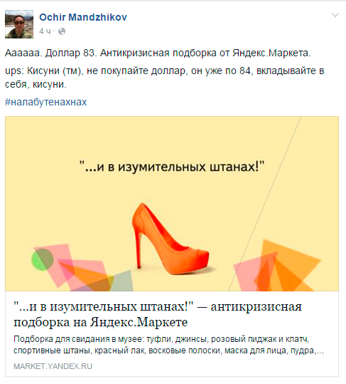 «Кисуни (тм), не покупайте доллар, он уже по 84, вкладывайте в себя, кисуни», - написал на своей странице в Facebook PR-директор «Яндекса» Очир Манджиков.