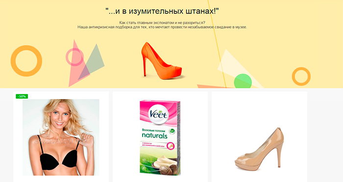В подборке на специально созданной странице с заголовком «...и в изумительных штанах!» покупательницам предлагают узнать, как «стать главным экспонатом и не разориться». Например, здесь можно приобрести велотренажер, помаду, восковые полоски для эпиляции, тональный крем, помаду, лак для ногтей, туфли Michael Kors, похожие на те, что были у героини клипа «Ленинграда» – в общем, полный набор для «свидания в музее».
