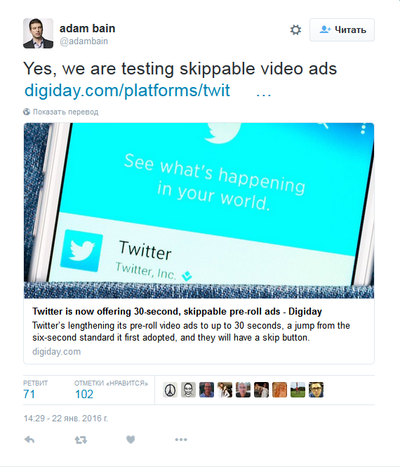 Ряд компаний-партнеров Amplify подтвердили, что на прошлой неделе им стали доступны новые форматы и кнопка «пропустить рекламу». Twitter отказался от официальных комментариев, но главный операционный директор компании Адам Бэйн подтвердил эту информацию в своем микроблоге.
