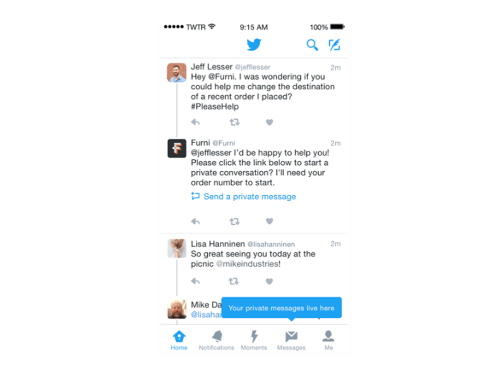 Идея создания первой функции основана на следующем наблюдении: нередко общение пользователей и брендов в рамках клиентской поддержки начинается в твитах, а затем, когда речь идет о передаче персональной информации, переносится в личные сообщения. Теперь совершить этот переход можно в один клик. Бренды смогут добавлять в твиты ссылки, благодаря которым пользователи будут видеть кнопку «Отправить личное сообщение» прямо в переписке в Twitter.
