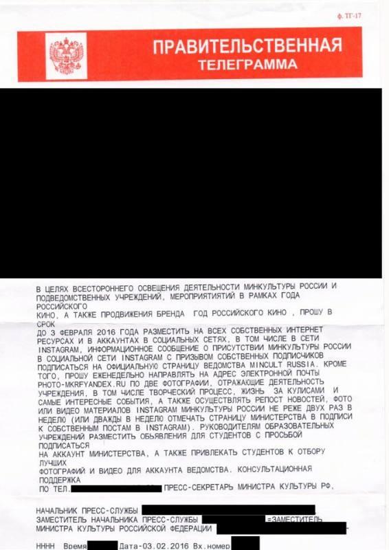 В документе отмечается, что в рамках года российского кино и для продвижения его бренда, подведомственные организации должны прорекламировать аккаунт Минкульта в Instagram во всех социальных сетях, а также предоставлять на еженедельной основе по две фотографии, отражающие рабочий процесс в учреждениях культуры. Помимо этого руководители образовательных учреждений должны обратиться к студентам с просьбой подписаться на страницу ведомства.