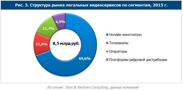 Онлайн-кинотеатры являются ключевым звеном рынка, в 2015 году они заработали 5,9 млрд рублей. У основных игроков резко увеличились доходы (на 50-70%), в том числе за счет развития платных сервисов. Это позволило некоторым из них заявить об операционной безубыточности. Телеканалы занимают второе место по объему доходов от легального видео с выручкой 1 млрд рублей. Это пока менее 1% от рекламных доходов в телеэфире, но бурный рост в онлайне количества каналов и их доходов продолжится.