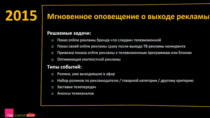 Такую услугу директор по телевизионным измерениям TNS Russia Ксения Ачкасова анонсировала еще в прошлом ноябре на клиентской конференции. Измеритель предложил интернет-компаниям получать практически в реальном времени – с задержкой менее пяти минут – информацию о выходе во всех телепрограммах рекламных роликов, спонсорских заставок и анонсов самих телеканалов. Эти данные интернет-компания сможет использовать в коммерческих целях: например, предложить рекламодателю показывать той же целевой аудитории рекламу этого же бренда после выхода телевизионного ролика, либо синхронизировать его выход на ТВ и в интернете, либо, наоборот, привлечь на свои ресурсы конкурентов телевизионного рекламодателя и тем самым нейтрализовать действие его сообщения.