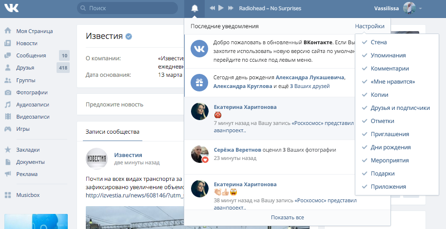 Раздел «ответы» полностью пропал из левой колонки меню, теперь он вынесен наверх в шапку сайта, по такому же принципу организована работа кнопки оповещений в Facebook. Если у американской соцсети она изображена в виде глобуса, то у «ВКонтакте» похожа на колокольчик. Пользователь может самостоятельно выбрать, о чем получать уведомления. Здесь отображаются отметки «Мне нравится», заявки на добавление в друзья, упоминания, дни рождения друзей и другие события.