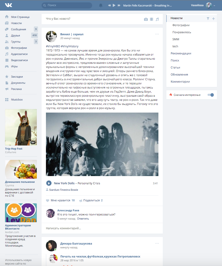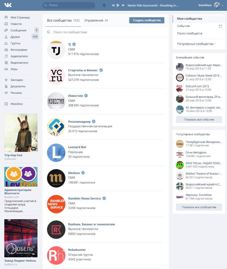 В разделе группы в правый блок вынесены рекомендации с популярными сообществами. Рекламные сообщения в левом блоке стали значительно крупнее.
