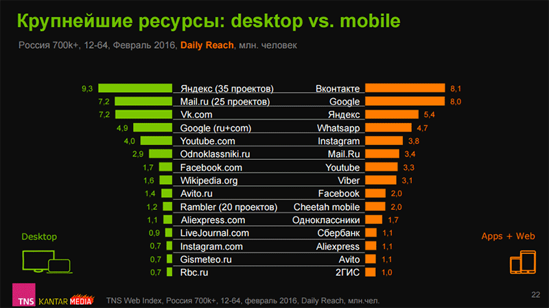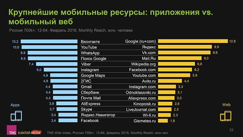 Самым популярным у россиян ресурсом в мобильном интернете (с учетом мобильных приложений) является, по данным на февраль 2016 года, Google – его ежемесячная аудитория в городах с населением от 700 тыс. человек на смартфонах и планшетах достигает 16 млн россиян 12-64 лет. Остается Google лидером и если рассматривать ежемесячную аудиторию только мобильных сайтов – 12,8 млн россиян, проживающих в городах с населением от 700 тыс. человек. Самым популярным мобильным приложением является «ВКонтакте» с ежемесячной аудиторией 10,2 млн человек. При этом «ВКонтакте» является самым популярным ресурсом на мобильных устройствах (интернет и приложения) уже по ежедневной аудитории – 8,1 млн человек. Для сравнения: у Google – только 8 млн.