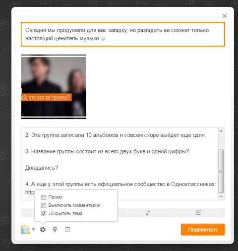 «Одноклассники» вводят новый инструмент, который поможет в таргетированном продвижении групповых заметок в социальной сети, сообщается в пресс-релизе. Выбирая пункт «скрытая тема», администратор создает пост, который не виден участникам группы в ленте и темах, а отображается лишь для определенной категории пользователей, выбранной при продвижении поста. При этом «скрытая» тема доступна по ссылке, ей можно поделиться или поставить «Класс».
