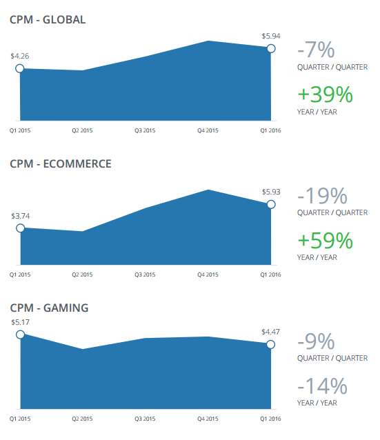 Цена за тысячу показов (CPM) в первом квартале снизилась на 7% и в среднем составила $5,94. За год рост CPM достиг 39%.