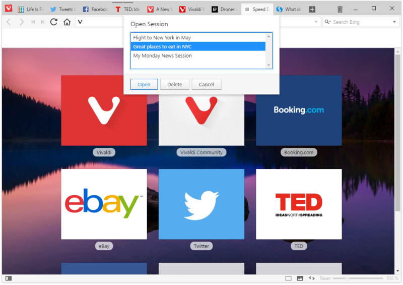 Сессии. Можно сохранить необходимый набор вкладок как сессию, чтобы вернуться к ним позднее.