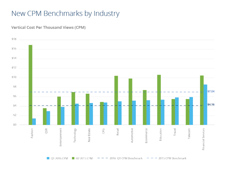 На фоне падения среднего CPM более чем в два раза по сравнению с 2015 годом представители розницы продемонстрировали отличные показатели в первом квартале 2016. Однако к весне CPM снова увеличился в связи с сезонными распродажами в онлайне.
