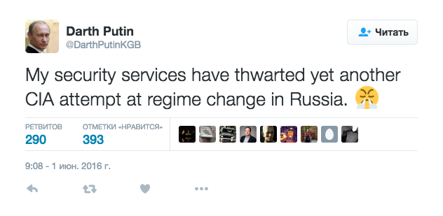 В самом аккаунте @DarthPutinKGB в 9:08 1 июня появился твит «Мои службы безопасности предотвратили очередную попытку ЦРУ сменить режим в России».