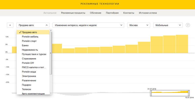 На сайте Рекламных технологий Яндекса появилась новая большая тема в разделе «Актуальное» — «Из офлайна в онлайн». Демонстрируемые здесь данные отражают динамику пользовательского интереса к той или иной тематике