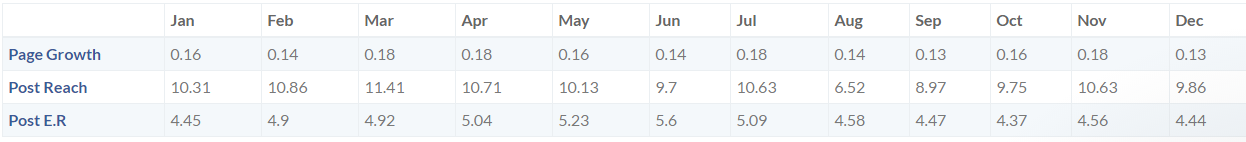 Так выглядят показатели роста числа подписчиков, охвата и активности посетителей страниц брендов в разбивке по месяцам 2016 года. Видно, что изменения происходили достаточно плавно. Наблюдалось существенное снижение показателей охвата в августе, но в последние два месяца года удалось выровнять показатели.