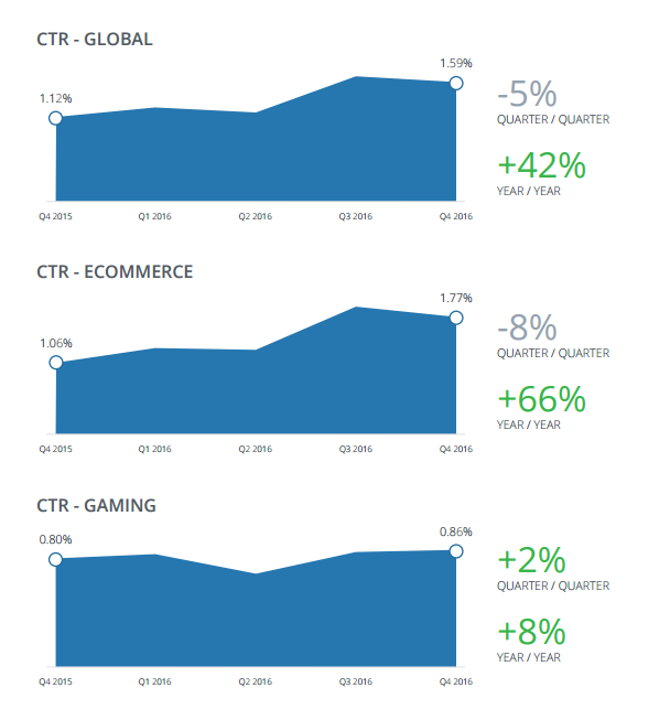 Глобально CTR в четвертом квартале 2016 г. «остался близок к рекордному показателю третьего квартала», говорится в отчете Nanigans. За трехмесячный период он упал на 5% – до 1,59%. При этом, если сравнивать с прошлым годом, в конце 2016 г. продолжился общий тренд на довольно сильный рост – по сравнению с 2015 г. CTR увеличился на 42%. Особенно ярко это проявилось среди рекламодателей из сферы электронной торговли (e-commerce): у них CTR вырос за год на 66%.