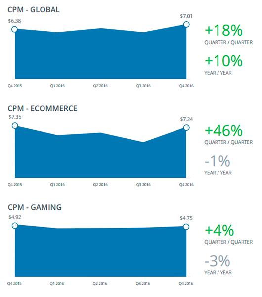 CPM на Facebook продолжает снижать темпы роста, отмечают специалисты. В 4 квартале 2016 г. этот показатель по всем брендам достиг в среднем $7,01. По сравнению с 2015 г. это больше на 10% – самый низкий годовой прирост за последние три года наблюдений Nanigans. Квартальный рост – 18% – тоже снизился по сравнению с 2015 годом (24%).