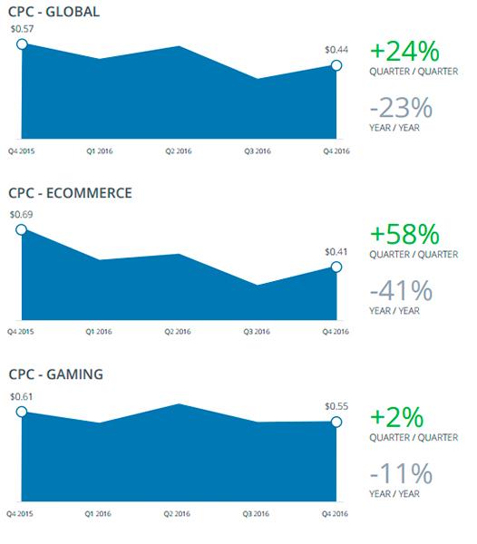 CPC за квартал вырос почти на четверть (24%) – до $0,44. При этом за год он упал на 23%. По мнению авторов доклада, это иллюстрирует тот факт, что CPC последние несколько лет остается в «достаточно узком коридоре» – где-то между $0,40 и $0,55. Это связывают с тем, что прирост CTR значительно опережает CPM.