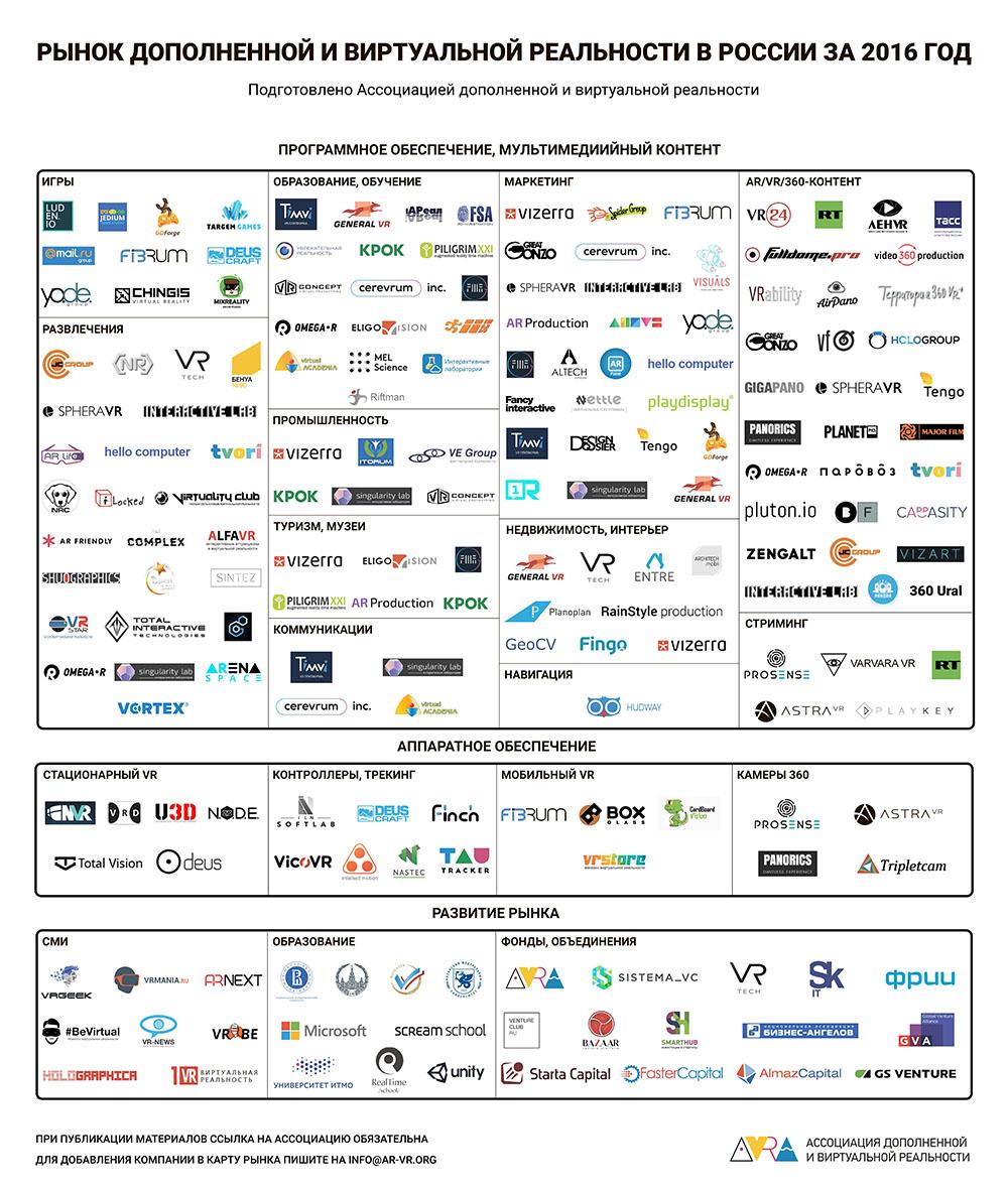 Объем рынка дополненной и виртуальной реальности в России за 2016 год составил 700 млн руб., подсчитала Ассоциация дополненной и виртуальной реальности (AVRA), что в 3,5 с половиной раза выше, чем в 2015 году. За 2016 год количество активно развивающихся VR & AR компаний в России выросло в 3 раза: с 60 до 183 компаний. Большая их часть (105) находятся в Москве.