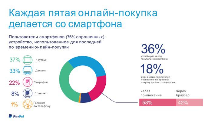 Увеличилось и число тех, кто делает покупки с мобильных устройств – по данным опроса, 18% онлайн-заказов делается со смартфона. Для владельцев смартфонов моложе 25 лет именно этот гаджет является самым популярным устройством для онлайн-покупок. Аудитория мобильных покупок быстро растет – хотя бы раз за год со смартфона покупали 36% опрошенных.