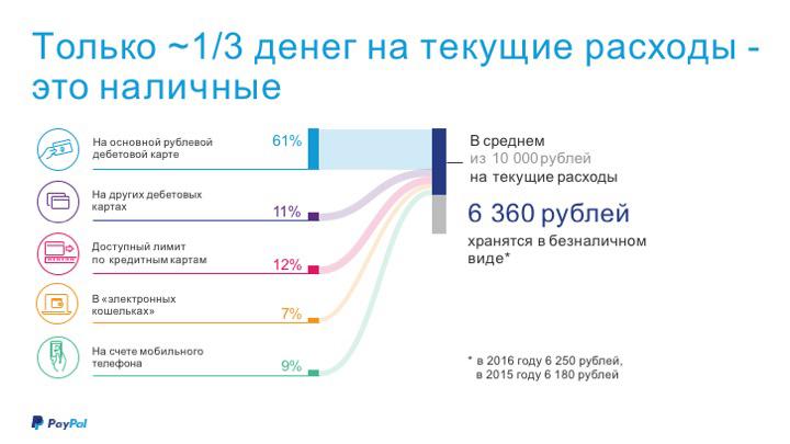 Кроме того, доля наличных денег в бюджете интернет-пользователей сокращается. В среднем, из 10 тыс. руб. на текущие расходы 6 360 руб. хранятся в безналичном виде. В 2015 году эта доля составляла 6 180 руб., а в 2016 году – 6 250 руб.