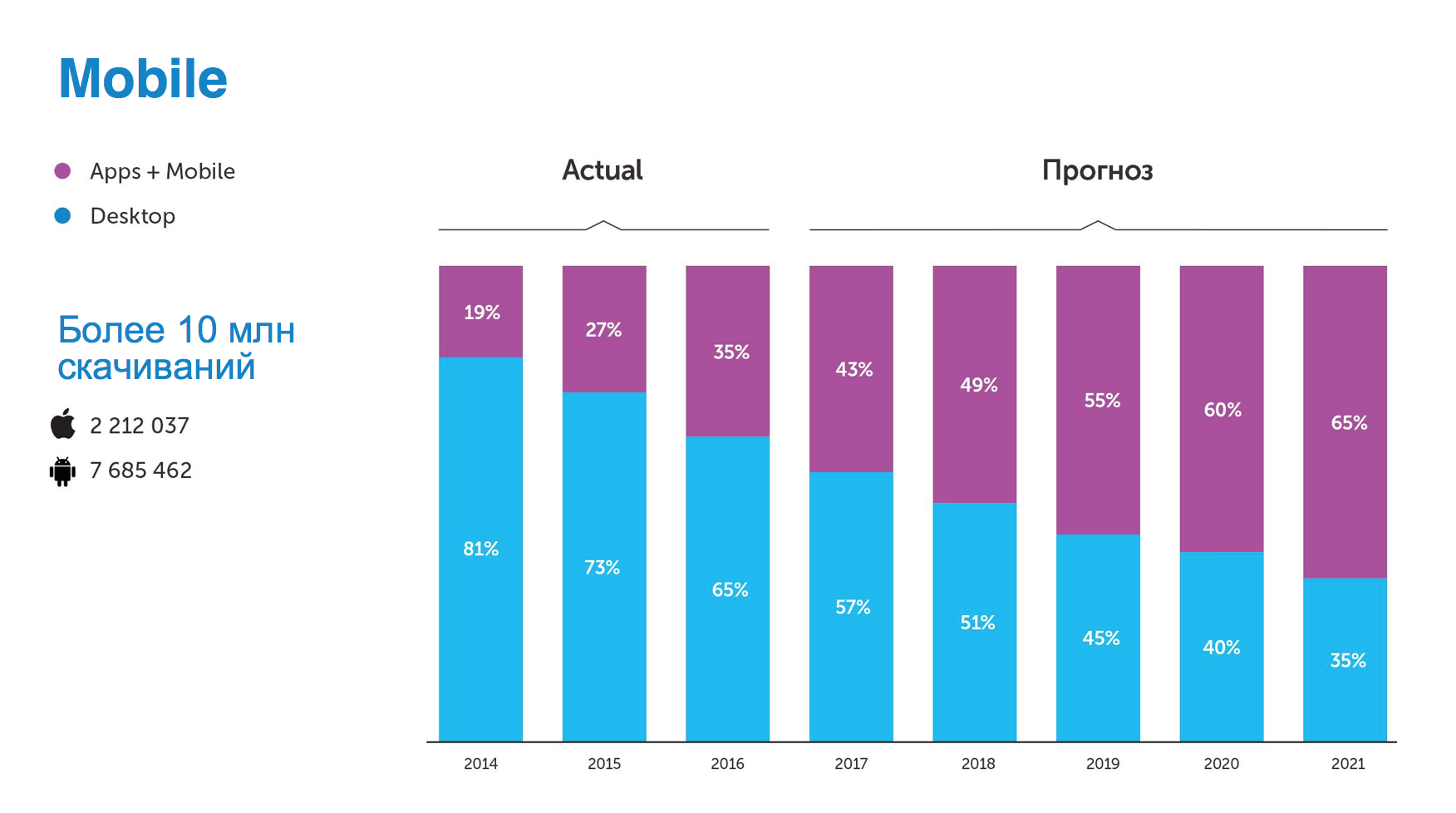 Доля мобильного трафика по итогам 2016 г. достигла 35%. В планах компании увеличить в 2017 году этот показатель до 43% и к 2021 г. довести его до 65%. Приложение Ozon за все время было скачано более 10 млн раз. На iOS — 2, 2 млн, на Android — 7,7 млн. Аудитория Ozon.ru - около 9 млн человек.