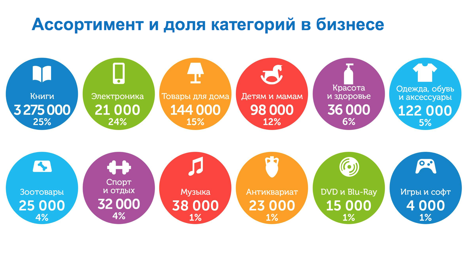 В 2016 году появились новые товарные категории – «товары для взрослых», «спортивное питание», «товары для ремонта» и «сладости». Наибольшая доля продаж приходится на книги – 25%, далее следуют электроника (24%) и товары для дома (15%). Самой быстрорастущей категорией стала категория «Зоотовары и продукты питания», ее рост – 227%, доля 4%. По 1% приходится на музыку, антиквариат, dvd, игры и софт. В начале этого года Ozon запустил совместный проект с «Аптечной сетью 36,6» по продаже лекарственных препаратов и изделий медицинского назначения в России. Также планируется открыть направление «Напитки», в которое войдут соки, воды, морсы и др.