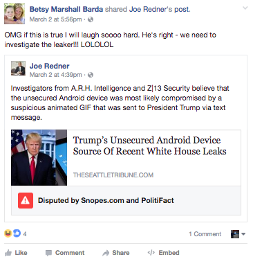 Facebook начал помечать фейковые новости в лентах пользователей, пишет Recode. О намерении реализовать эту инициативу в соцсети заявляли в декабре прошлого года. В частности, подобную пометку получила новость издания The Seattle Tribune о том, что якобы смартфон Дональда Трампа стал причиной последних утечек из Белого дома в СМИ.