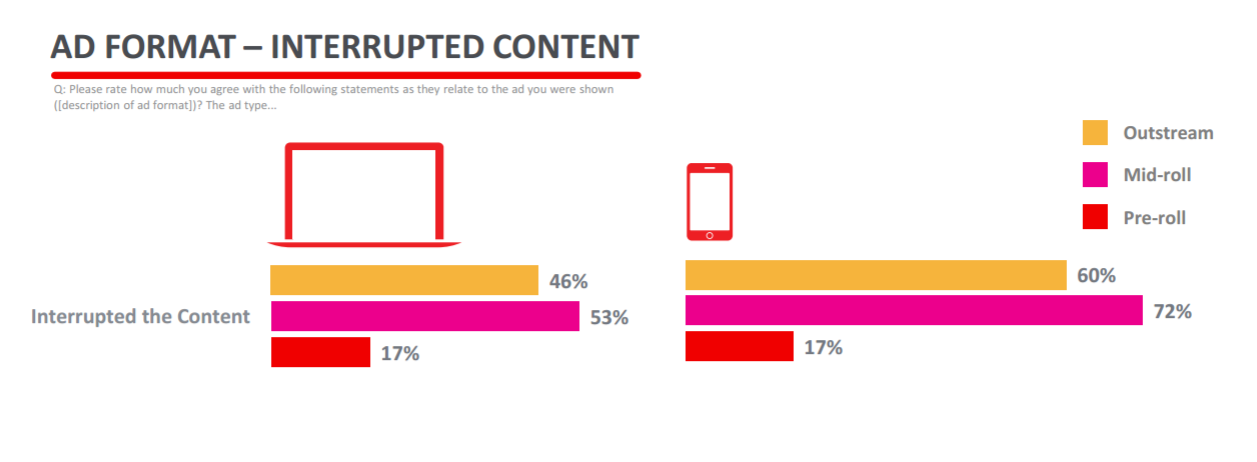 Результаты исследования показали, что хотя пользователи и находят все рекламные форматы навязчивыми, прероллы в меньшей степени воспринимаются как прерывающие контент. Только 17% опрошенных посчитали эту рекламу мешающей. Для outstream-формата эти цифры оказались гораздо выше: 60% мобильных пользователей и 46% десктопных. У мидроллов показатели еще хуже – 72% и 53% соответственно.