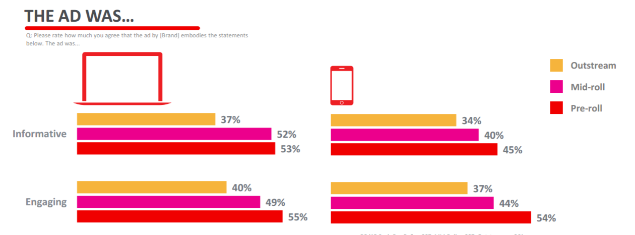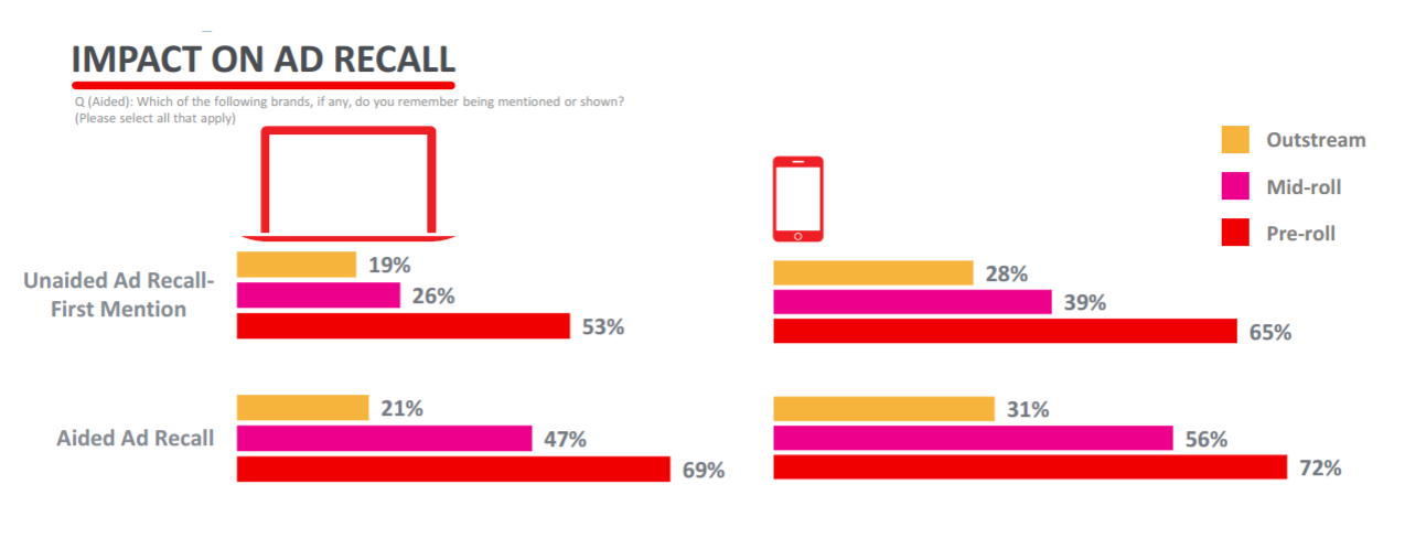 Эффективность рекламы в прероллах тоже оказалась выше, чем у других форматах: 65% участников исследования смогли назвать бренды, которые они видели в рекламном видео на мобильном. Для сравнения, 39% пользователей сделали это после просмотра рекламы в середине ролика, и всего 28% после outstream-объявления.
