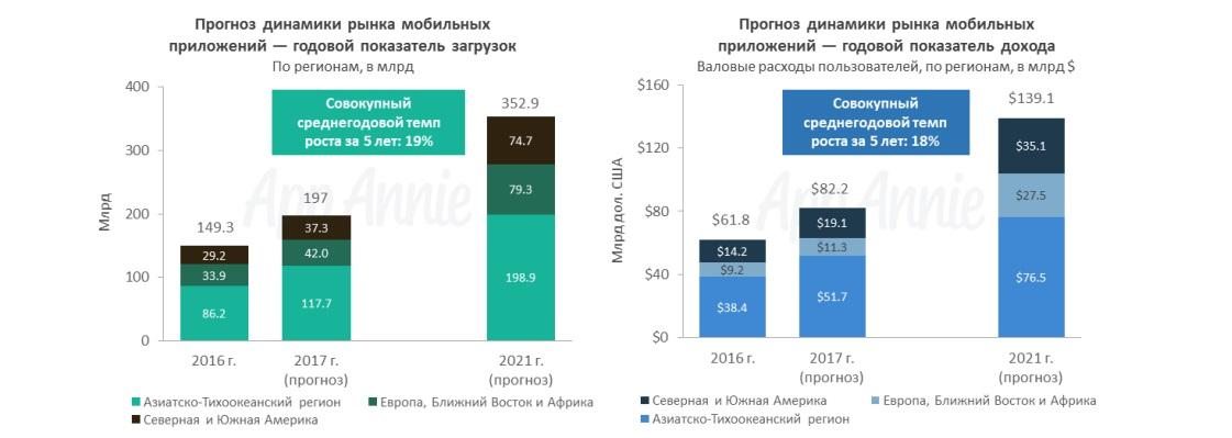 Согласно прогнозу, к 2021 году расходы пользователей из России на мобильные приложения превысят $400 млн