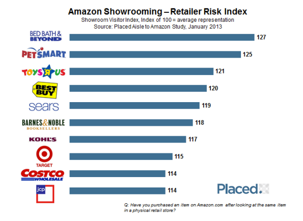 Placed специализируется на анализе мобильной панели, позволяющей определить перемещения пользователей. Благодаря этой технологии возможно собрать показатели для предоставления информации по многим вопросам – начиная от того, как расходы на ТВ-рекламу влияют на посещение магазинов, до сбора геолокационных данных, например, игроков Pokémon Go. Так, здесь показан анализ Placed, показывающий начиная с 2013 года, где клиенты Amazon посещают шоурумы чаще всего: