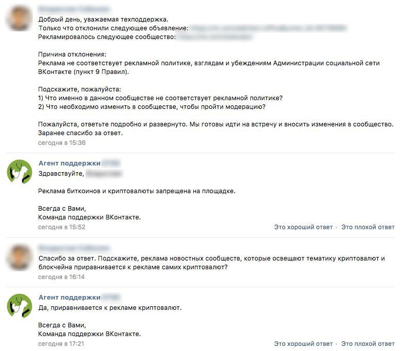 По словам представителя «ВКонтакте» Евгения Красникова, в компании нет полного запрета на упоминание криптовалют в рекламе и все случаи рассматриваются индивидуально. Однако объявления сайтов, на которых публикуются инструкции по работе с криптовалютами, скорее всего будут отклонены, сказал он vc.ru.