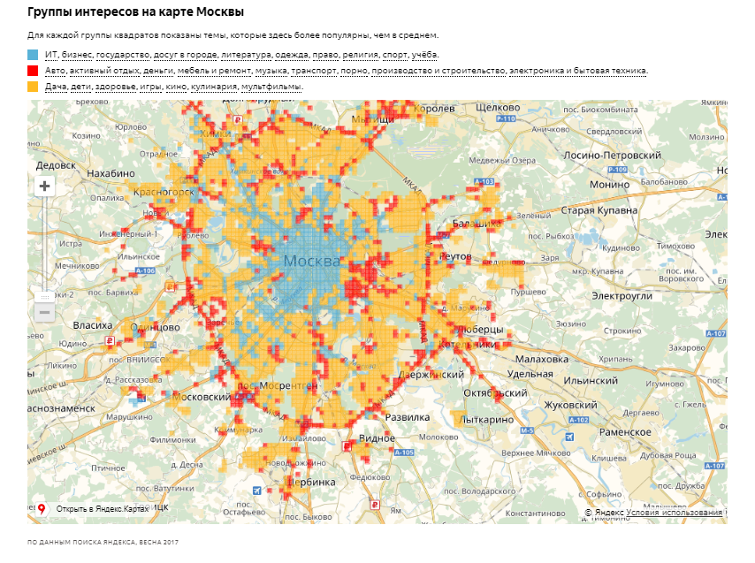 «Яндекс» по поисковым запросам разделил Москву на три большие области – в зависимости от того, что ищут больше или меньше. «Первая – это центральные районы. Здесь чаще задают запросы, связанные с офисной работой и образованием, городскими развлечениями, покупкой одежды. Вторая – промзоны и крупные магистрали: тут выше интерес к производству и строительству, транспорту, банкам, автомобилям, электронике, инструментам. Также, судя по поисковым запросам, здесь больше слушают музыку и смотрят порно. Третья область – спальные районы, в них чаще ищут кино, игры и другие развлечения в интернете, а также спрашивают про разные домашние дела», - отметили в «Яндексе».