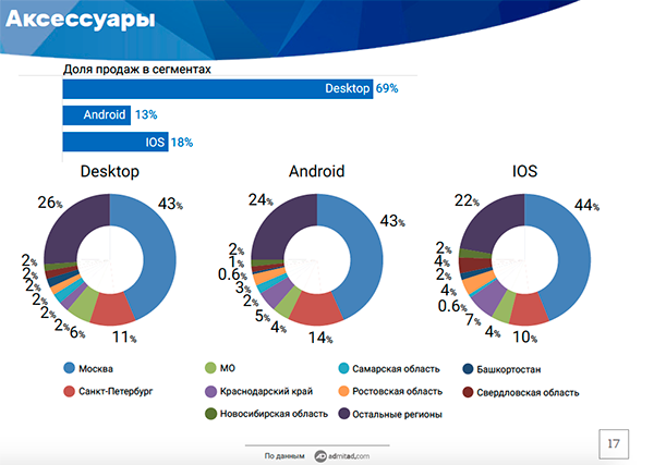 С помощью стационарных компьютеров за первую половину 2017 года россияне сделали 80% покупок в интернете. С устройств на iOS чаще заказывают товары жители Москвы и Санкт-Петербурга. Предпочтения покупателей на iOS и десктопах совпадают: детские товары, зоотовары, аксессуары. С Android россияне чаще покупают китайские товары и автозапчасти