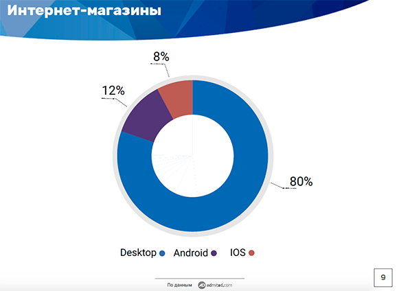 80% покупок в интернете за январь-июнь 2017 года россияне совершили, заходя в магазины со стационарных компьютеров, 12% пришлись на устройства на операционной системе Android, 8% – на iOS. Об этом объявили представители партнерской сети Admitad на совместной пресс-конференцией с Ассоциацией компаний интернет-торговли (АКИТ) и Почтой России. Исследование было проведено на основе собственных данных Admitad.