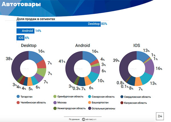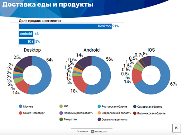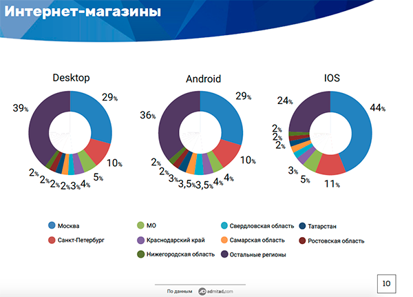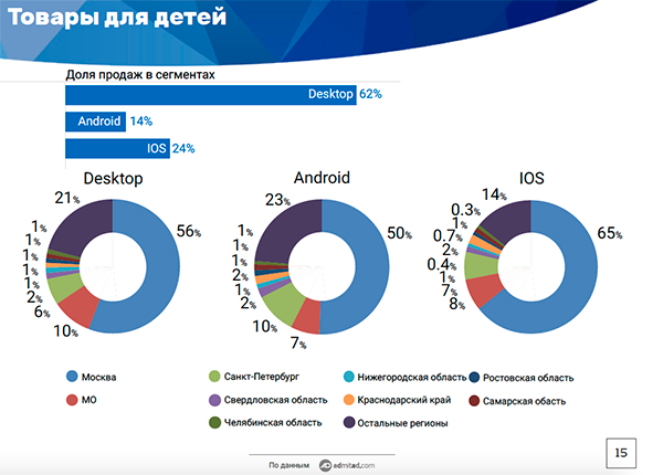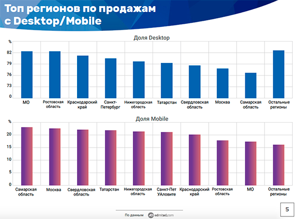 Десктоп оказался наиболее популярен для интернет-покупок у жителей Московской, Ростовской областей, Краснодарского края, Санкт-Петербурга и Нижегородской области. Наиболее высокую долю мобильные устройства получили в покупках, сделанных в Самарской области, Москве, Свердловской области, Татарстане и Нижегородской