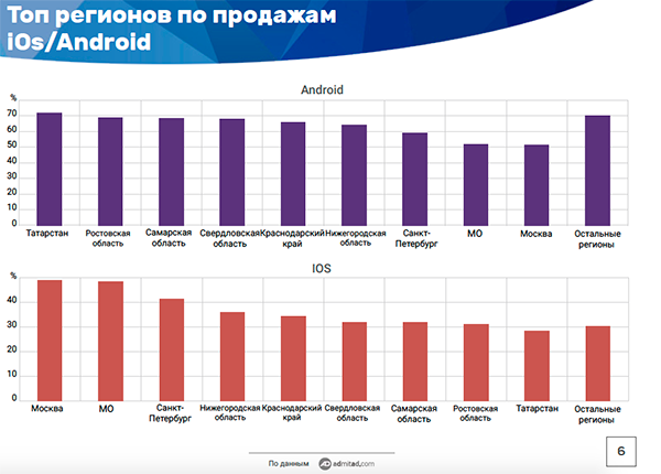 Android наиболее популярен у интернет-покупателей в Татарстане, Ростовской, Самарской, Свердловской областях и Краснодарском крае. iOS занимает высокую долю в Москве и Московской области, Санкт-Петербурге, Нижегородской области.