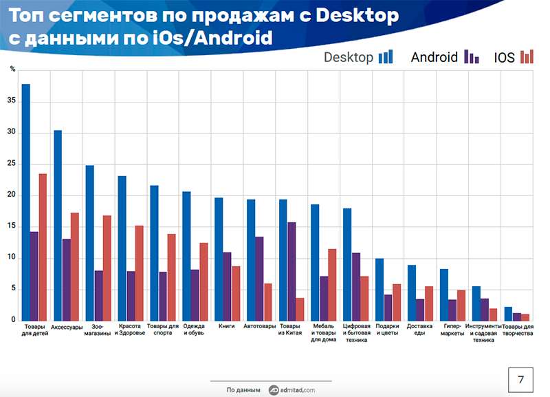 Наименьшая доля покупок со стационарных компьютеров в сегментах товаров для детей (62%), аксессуаров (69%) и китайских товаров (70%).