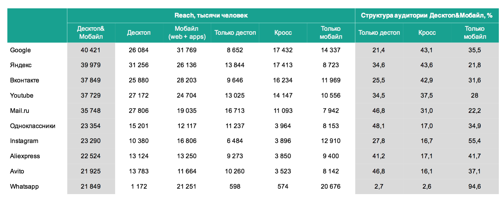 Как читать таблицу: Столбец Десктоп&Мобайл показывает совокупную аудиторию проекта в тысячах человек. Это россияне 12-64 лет, проживающие в городах 100k+, которые хотя бы 1 раз в месяц на любом устройстве зашли на указанный сайт и/или в мобильное приложение.